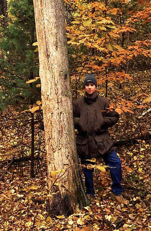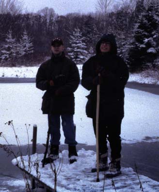 LEFT: Steve lays back and enjoys a kayak trip down a river in Michigan's Upper Peninsula, 2000 RIGHT: Steve and his mom take a winter hike in the state forest land near their house, 1998 |